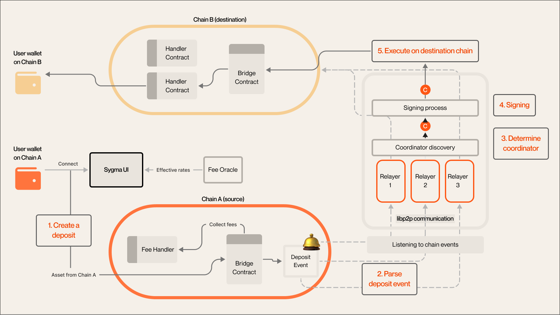 Sygma uses an offchain relayer network to verify events on one chain that are to be posted to a destination chain. These relayer nodes, or agents, use a variety of verification systems to determine canon across chains.