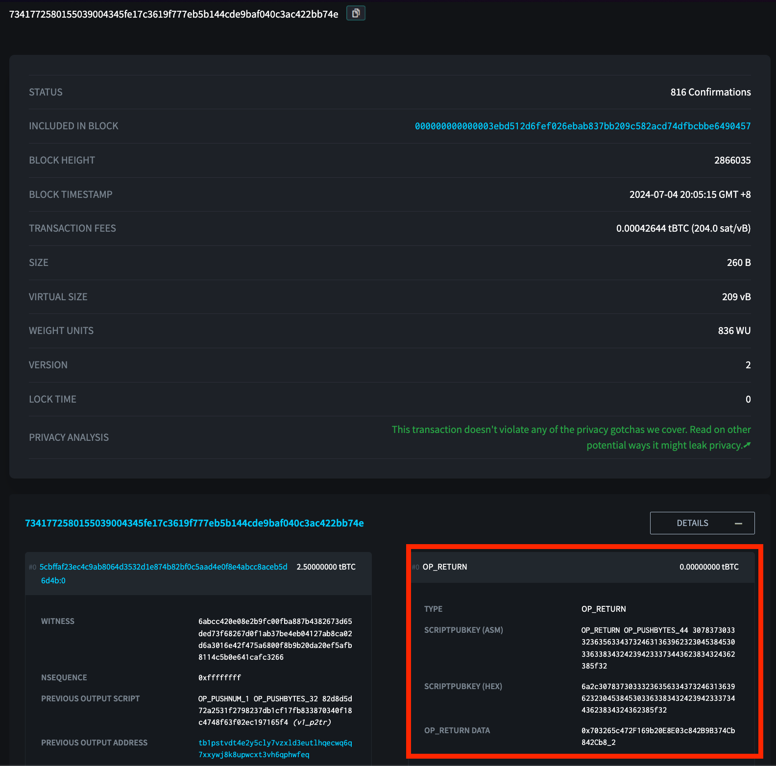 OP_RETURNdata containing the metadata (0x703265c472F169b20E8E03c842B9B374Cb842Cb8_2). The metadata indicates the address the funds should be bridged to as well as the domain ID (2), which represents Ethereum Sepolia.