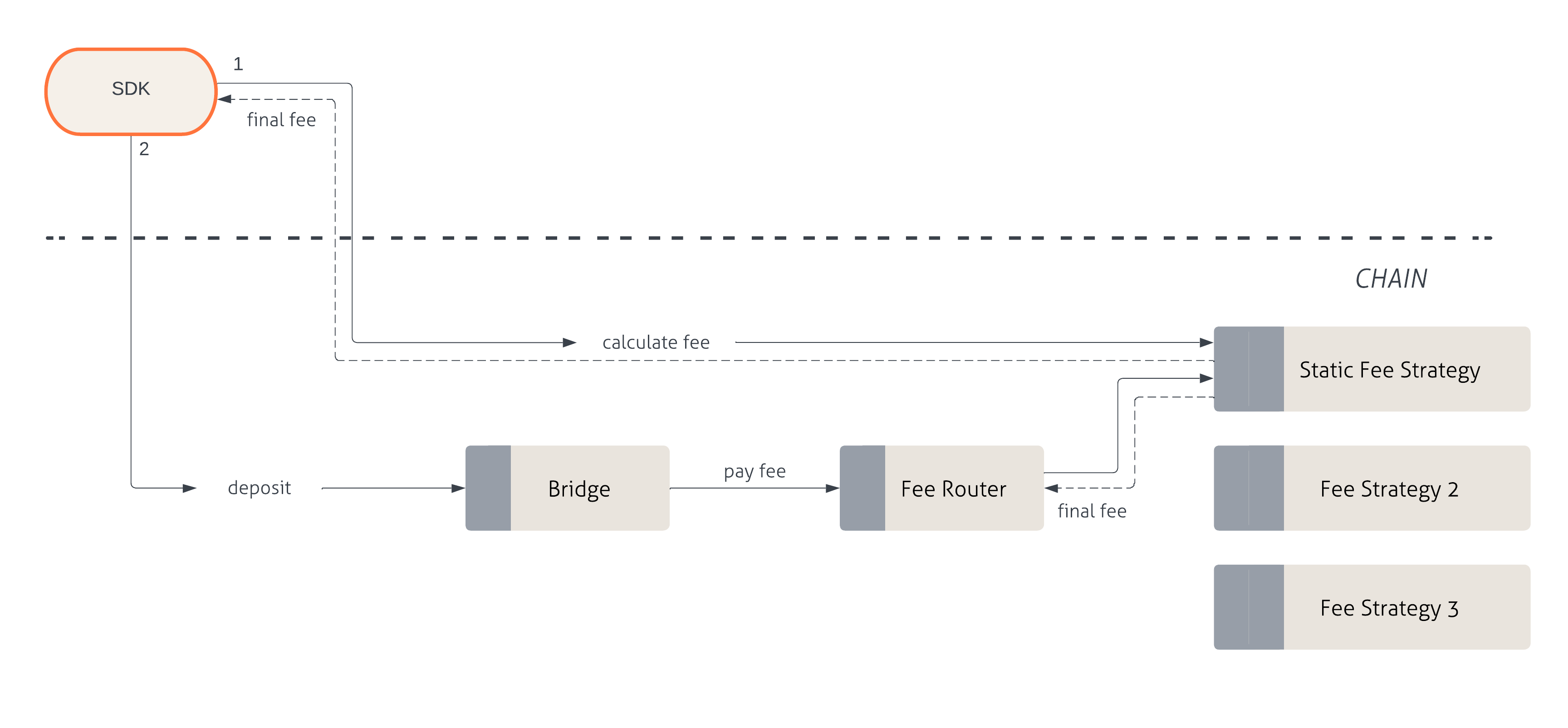 The fixed fee strategy always requires a predefined fixed fee amount per deposit. It can only collect fees in the native currency (e.g. ETH, MATIC) of the source chain.