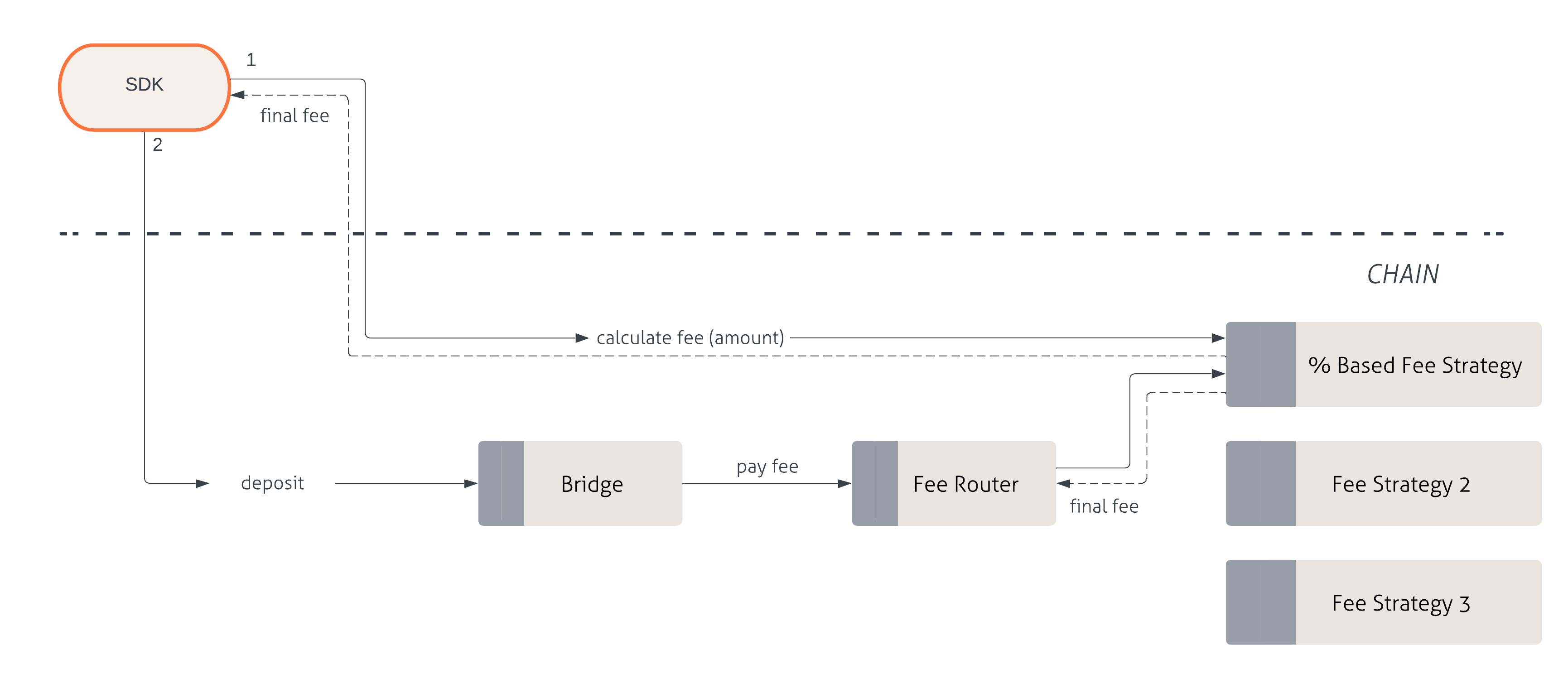 resourceID,domainIDand amount, request a final fee amount that will be required to execute the deposit. 2) Execute deposit - Send the appropriate token amount based on the calculated final fee when executing the deposit.