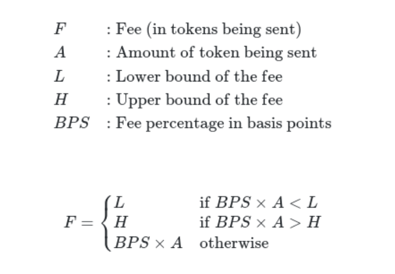 To set fees as 1 BPS, the value 10000 would be passed in to account for precision loss on Solidity. Upper and/or lower bounds can also be set. For example, if the calculated fee is less than the lower bound, the lower bound token amount will be charged. If the calculated fee is greater than the upper bound, the upper bound token amount will be charged. If no bounds are set, the BPS value will be charged regardless of the fee calculation amount.